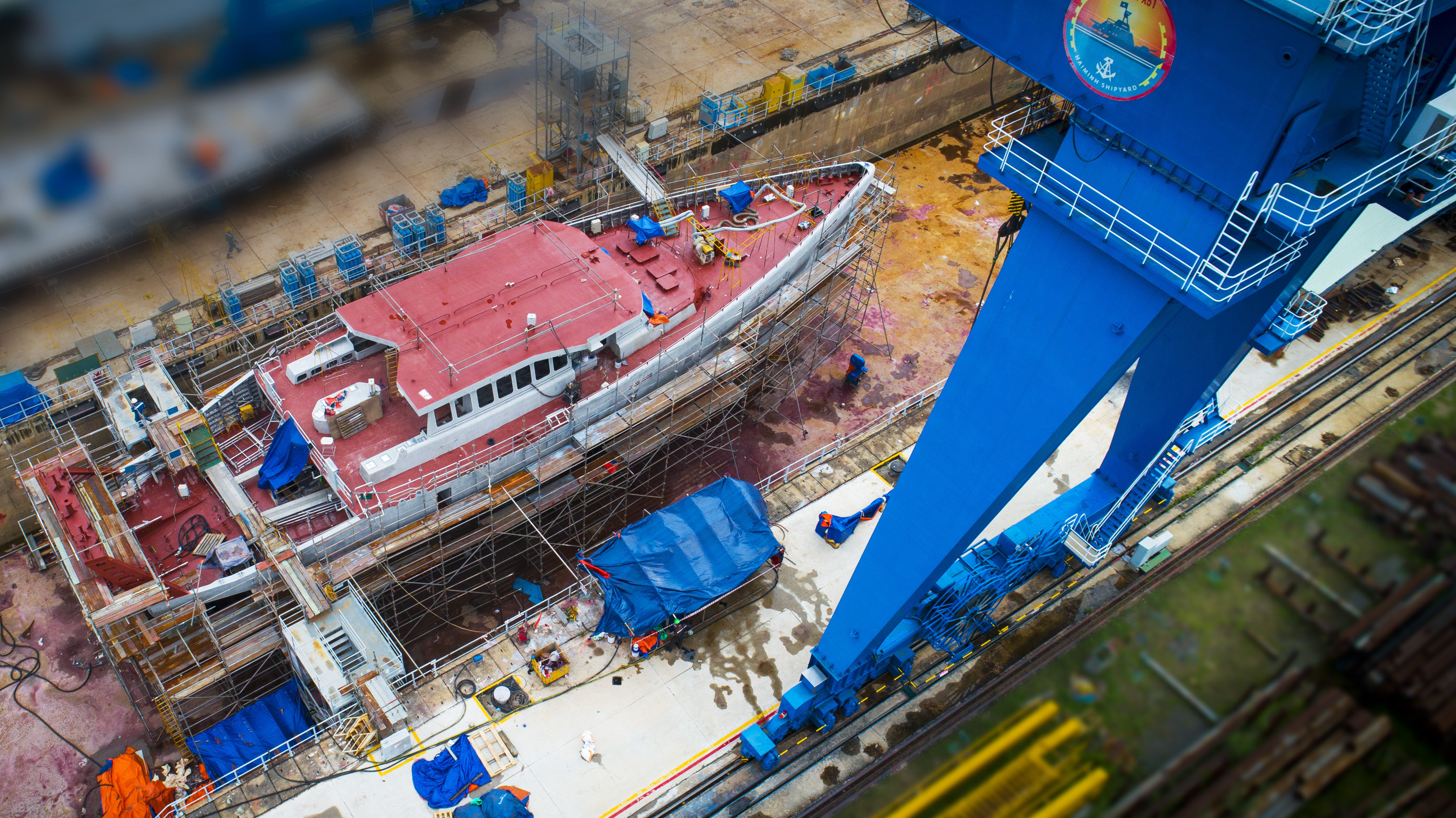 Le bateau a été « sablé », son aspect est uniforme et les soudures ne se voient plus. La première couche de peinture a été posée : c’est « l’anti fooling », un revêtement qui empêche les algues et les crustacés de s’accrocher sur la coque. La ligne d’arbre, qui relie le moteur à l'hélice a été montée.
