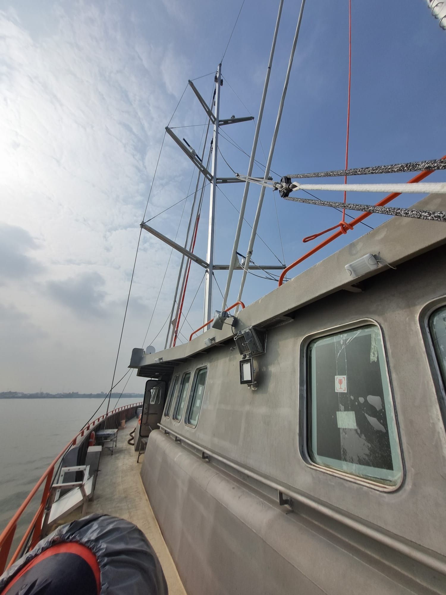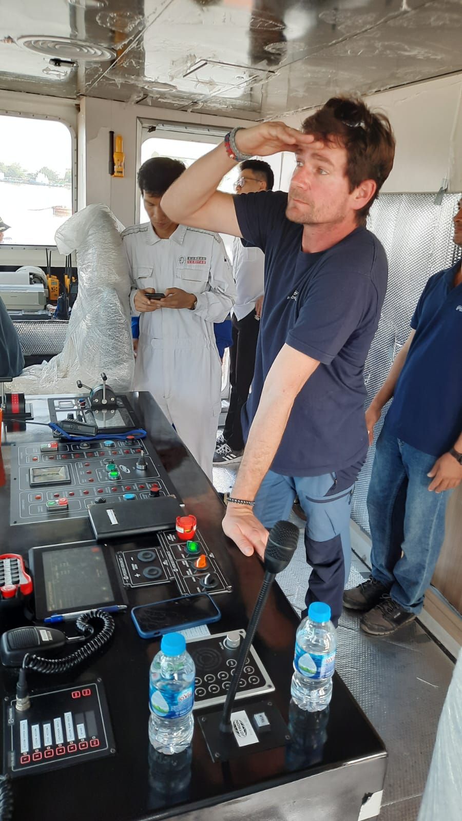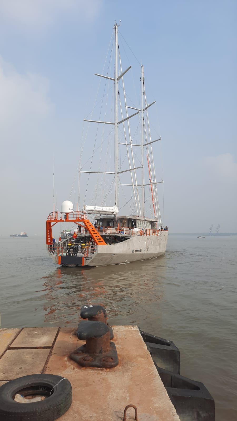 Remi Gerbaud des mâts Maréchal et Eric Cochet spécialiste du gréement ont fait une courte navigation sous voile et sur eau calme.