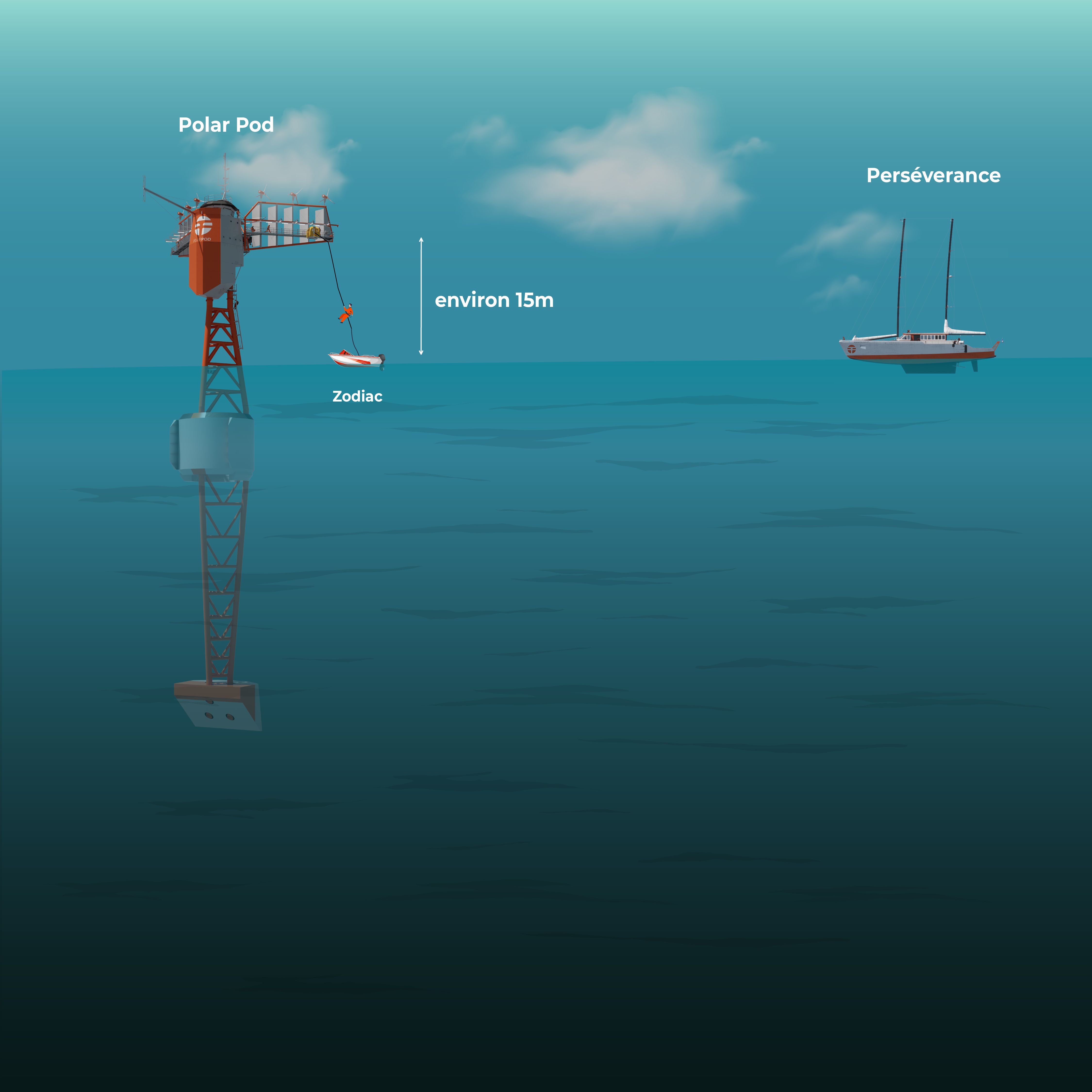 Avec son annexe spécialement adaptée, l'équipage sera amené à la verticale d’une aile du Polar Pod où individuellement ils seront treuillés à environ 15 mètres de hauteur pour rejoindre la plateforme flottante.