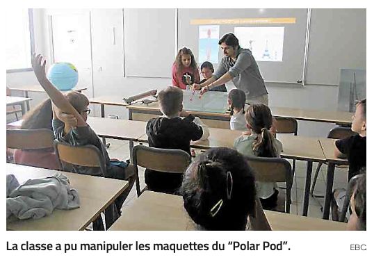 « Mon métier, c’est de faire le tour de la France avec des maquettes », se présente Clément Lepotier aux 23 élèves de CM1- CM2 réunis ce jeudi matin au lycée Victor-Hugo. En réalité, il est médiateur scientifique intégré au projet d’exploration “Polar Pod”. À bord du “Polarpodibus”, une fourgonnette qui abrite le matériel scientifique, le médiateur sillonne les académies pour présenter la mission ; mais aussi vulgariser l’écosystème complexe des fonds marins. Le projet s’est construit avec l’appui de l’Éducation nationale et la direction générale de l’enseignement scolaire (DGESCO). Dans une salle prêtée par le lycée, primaires, collégiens et lycéens assistent aux cours interactifs de Clément Lepotier. À l’aide de maquettes, de supports audios et vidéos, le projet de construction du navire océanographique Polar Pod, mené par Jean Louis Étienne, est détaillé. « Les adultes aussi apprennent des choses », souffle Élodie Parra, maîtresse de la classe de ce matin.