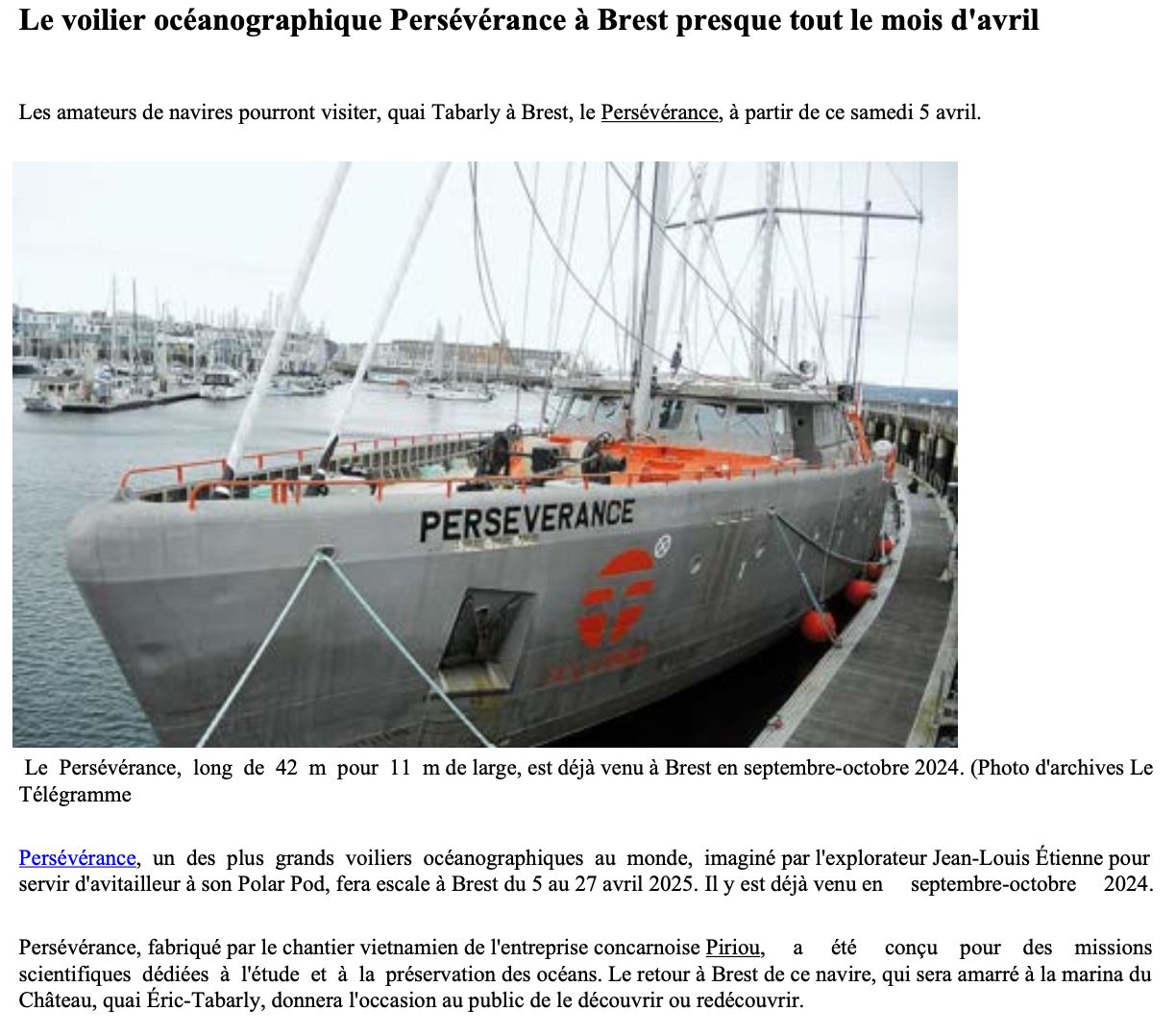 Le voilier océanographique Persévérance à Brest presque tout le mois d'avril - Le Télégramme