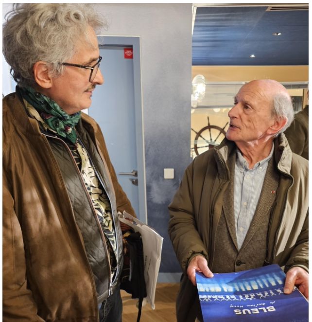 Gaétan Nocq et l'explorateur Jean-Louis Etienne, "le Marcheur du pôle", au Musée de la marine, vendredi. - ACTUA BD