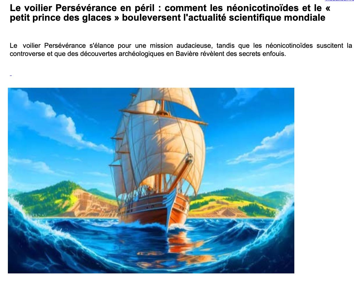Le voilier Persévérance s'élance pour une mission audacieuse, tandis que les néonicotinoïdes suscitent la controverse et que des découvertes archéologiques en Bavière révèlent des secrets enfouis.