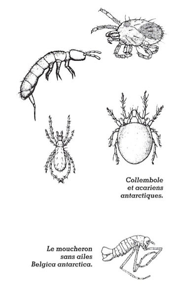 De petits invertébrés à cycle de reproduction rapide peuvent seuls tirer profit de l'été antarctique. La succession de tous les stades larvaires demande parfois plusieurs hivers. On rencontre des acariens, des nématodes, des tardigrades, des collemboles, des moucherons et des rotifères. Le géant de l'Antarctique est un moucheron sans ailes de 12 mm : Belgica antarctica. D'autres invertébrés vivent dans les lacs (crustacés copépodes) ; d'autres encore prolifèrent en parasites (poux, tiques, vers...) sur ou dans le corps des animaux supérieurs.