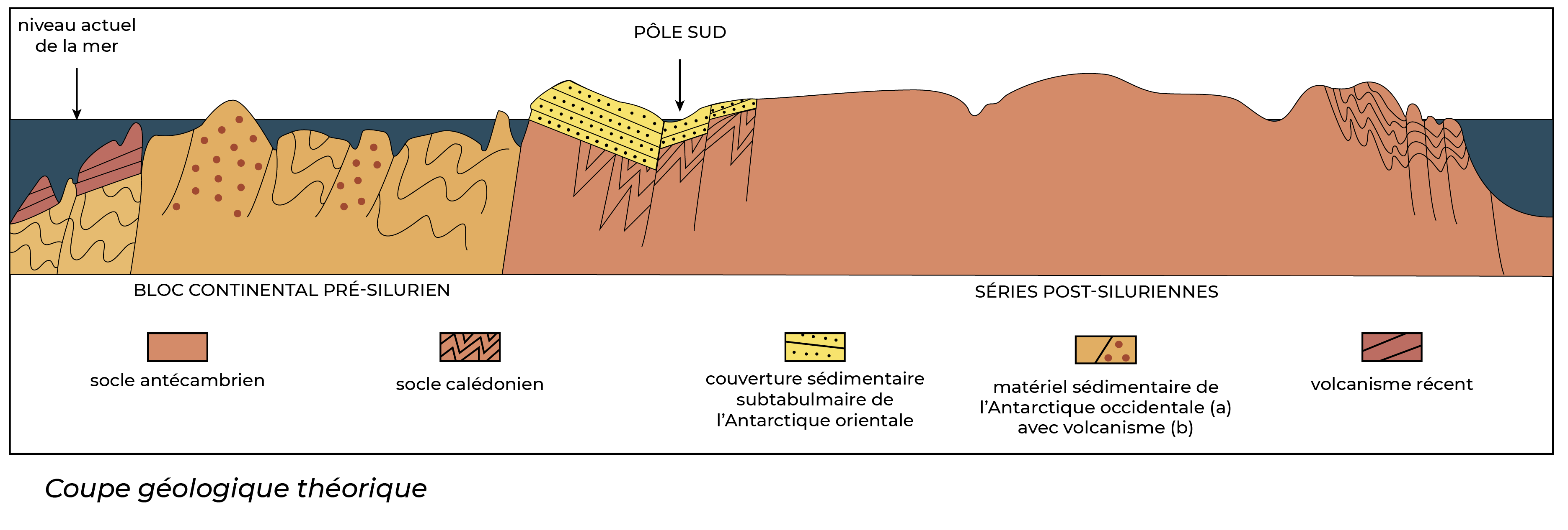 Coupe géologique schématique du continent Antarctique (silurien = de 32 à 250 millions d'années).
