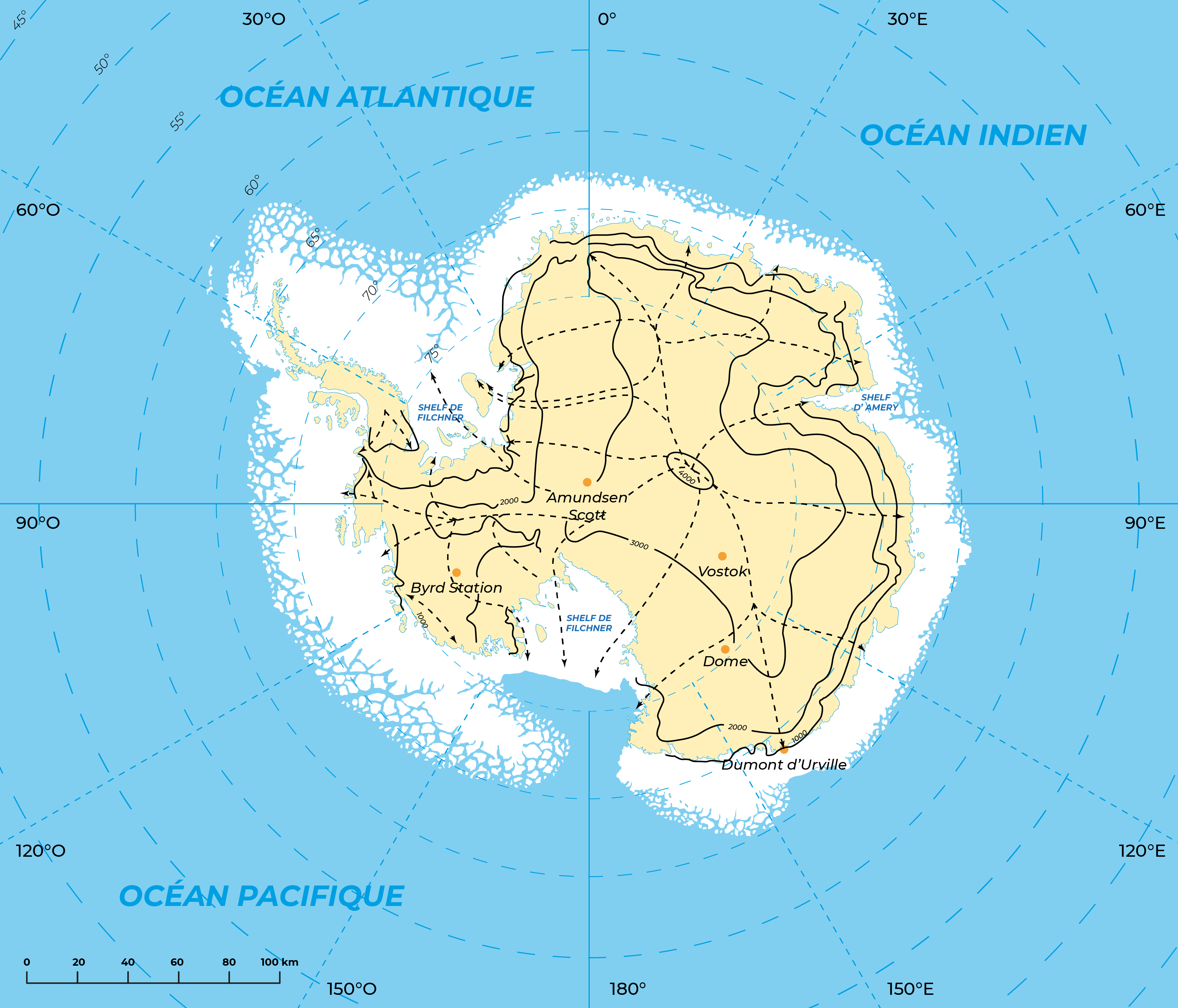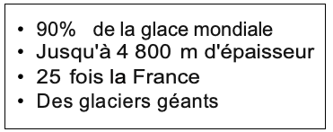 La calotte glaciaire antarctique a des dimensions gigantesques. Trente millions de km² d'eau sont retenus ici : 90 % de toute la glace terrestre ! À l'Est, la couche atteint 4 800 m au point le plus épais (69°54'S, 135°12'E) et sa base s'enfonce à 2 550 m au-dessous du niveau de la mer dans la dépression du socle la plus importante, la fosse de Bentley. En revanche, au Dôme Argus, la calotte ne mesure que 1 000 m d'épaisseur malgré une altitude de 4 000 m, car à cet endroit-là, elle recouvre totalement une montagne sous-glaciaire : le massif Gamburtsev. Cette calotte continentale ou islandsis, est inégalement répartie. La portion qui recouvre l'Antarctique de l'Est (que l’on peut appeler la calotte de l’Est) s'étend sur 10 millions de Km² tandis que la calotte Ouest est 5 fois plus réduite et 2 fois moins épaisse. Les glaciers de la Péninsule et toutes les plates-formes glaciaires flottantes, des prolongements de l'inlandsis, ne totalisent que 2 millions de Km².