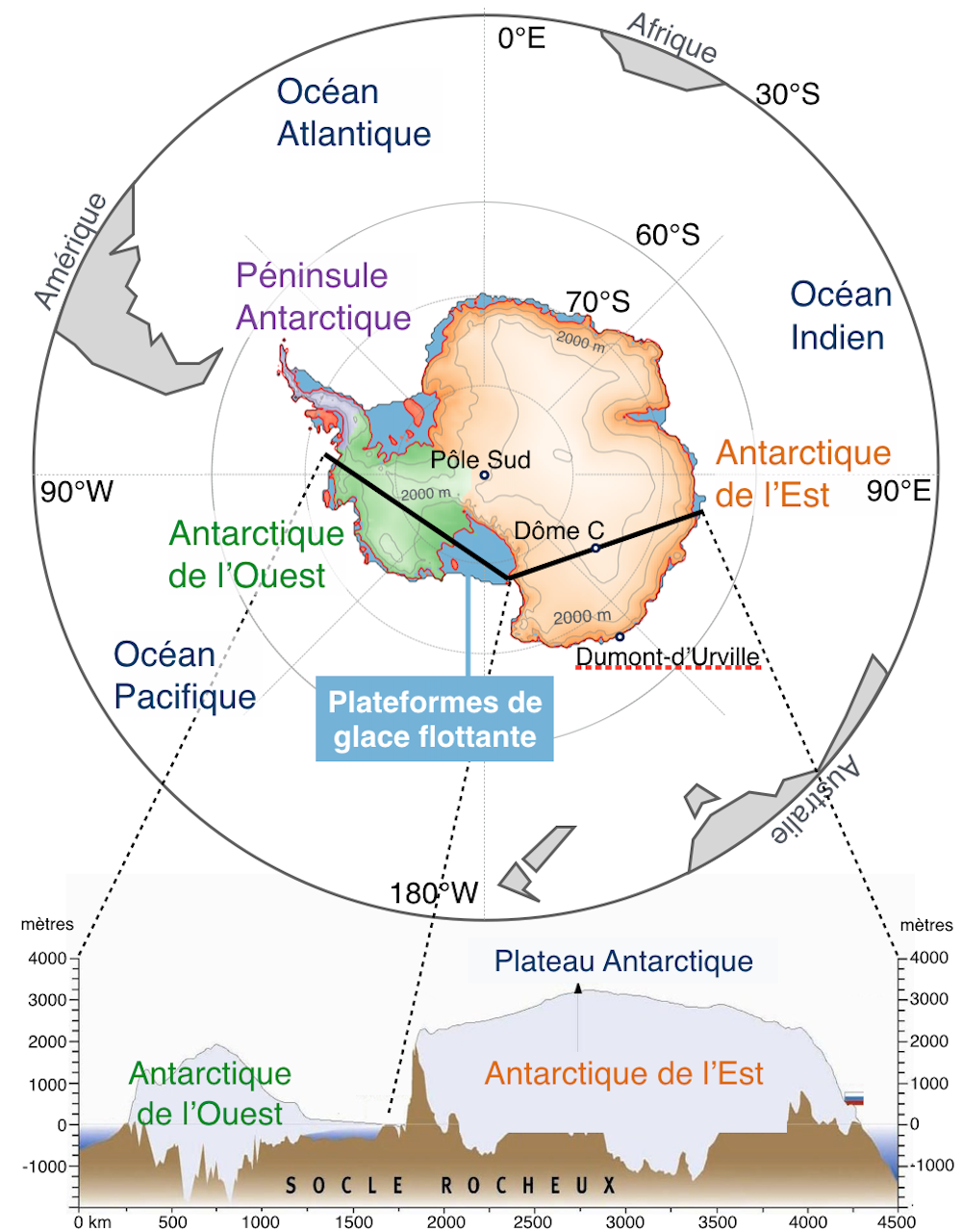 La calotte polaire antarctique et ses principaux bassins ; en bas, coupe transversale montrant l’élévation de la calotte et du socle rocheux (F. Rémy/LEGOS). Cécile Agosta