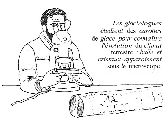 Et le climat passé apparaît à la lecture des carottes. Lors du maximum glaciaire d'il y a 18 000 ans, la température terrestre était inférieure de 7 °C à celle d'aujourd'hui. Pendant ce temps, 20 fois plus de poussières circulaient dans le ciel dues, non pas à des éruptions volcaniques comme on l’a longtemps pensé, mais à des vents de sable sur les continents arides. En revanche, le gaz carbonique (un gaz à « effet de serre ») avait chuté, au même moment, au 2/3 de la valeur actuelle. On retrouve également les variations climatiques liées aux fluctuations astronomiques de l'orbite terrestre autour du soleil (périodes de 100 000, 20 000 et 10 000 ans) appelés cycles de Milankovitch.