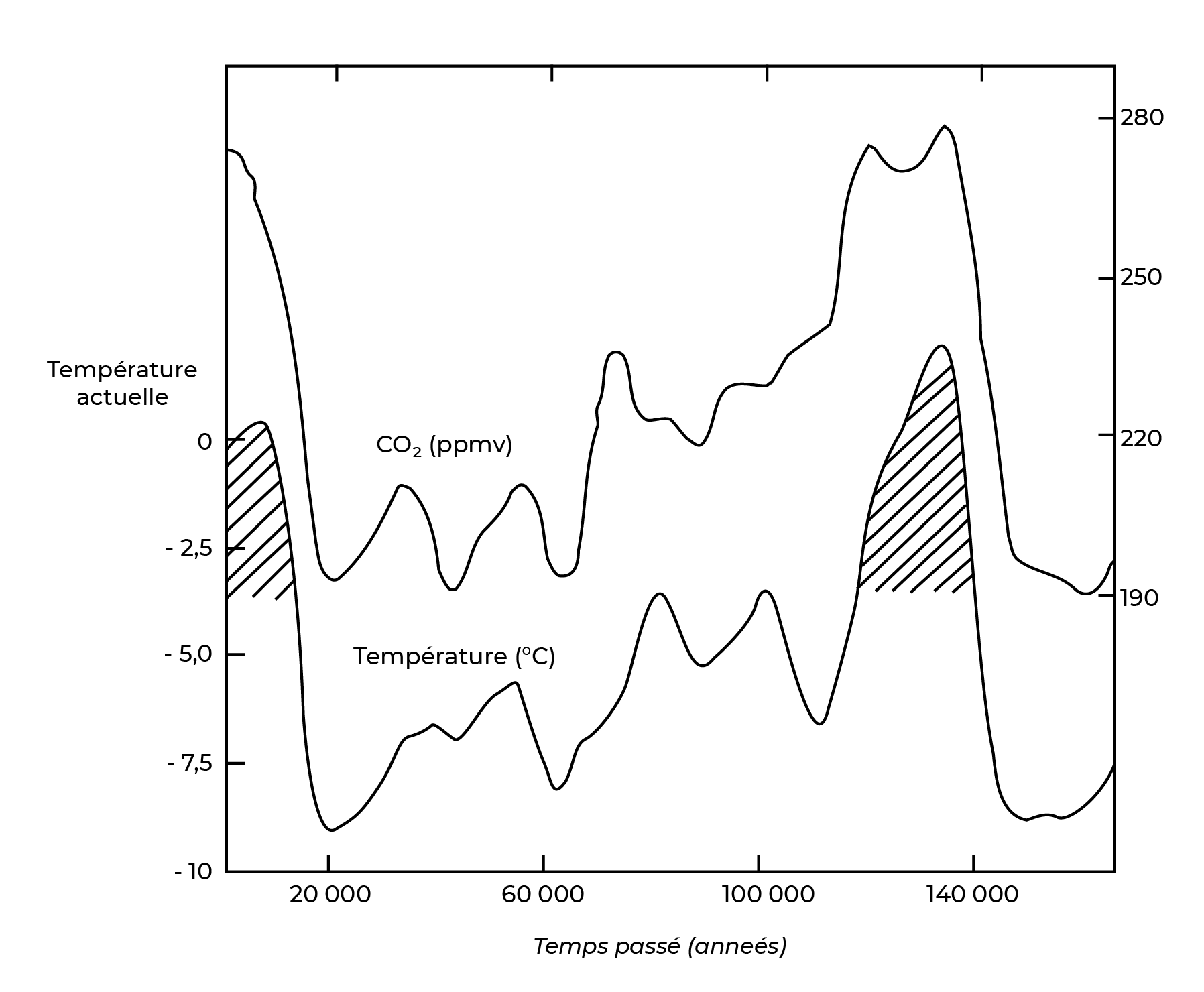 Depuis 150 000 ans, les variations de la température mondiale sont en corrélation avec celles du gaz carbonique contenu dans l'atmosphère, d'après l'étude de la carotte de glace de Vostok.
