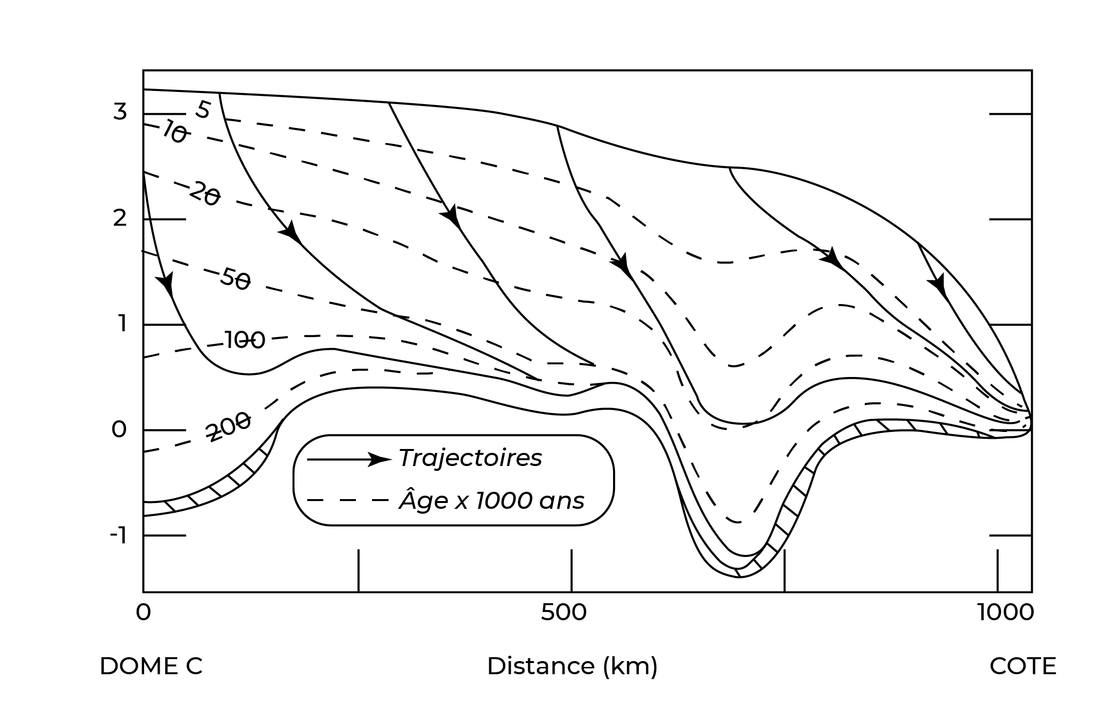 Coupe de la calotte glacière montrant l'écoulement de la glace, du Dôme C jusqu'à la côte de Terre d'Adélie.