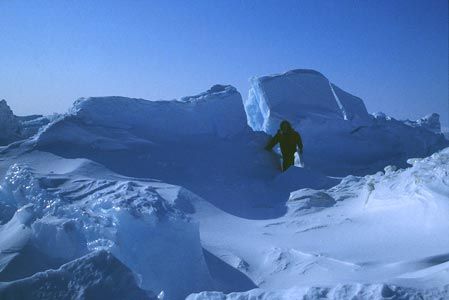 La banquise n’est qu’une fine coquille d’œuf comparée aux 4000 mètres d’eau sur lesquels elle flotte ! Emportée par les courants, harcelée par les vents, sans cesse elle se brise, s’ouvre, se chevauche, créant, ici, des chenaux d’eau libre, là des rides de glace dont la crête peut atteindre une dizaine de mètres de haut.