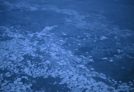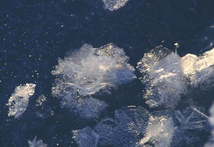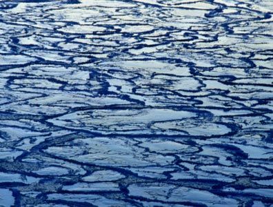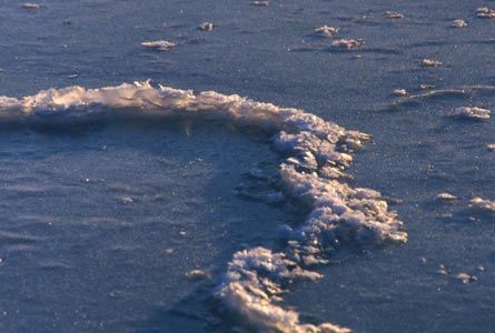 Tant que la glace est fine, houle et vents la fragmentent en ” crêpes “, qui finissent par se souder et former la jeune banquise, capable alors de retenir la neige. Il faut plusieurs semaines pour que la glace atteigne 60 cm d’épaisseur. En chassant lentement bulles d’air et saumures, la glace se compacte, s’adoucit, devient bleue et translucide.