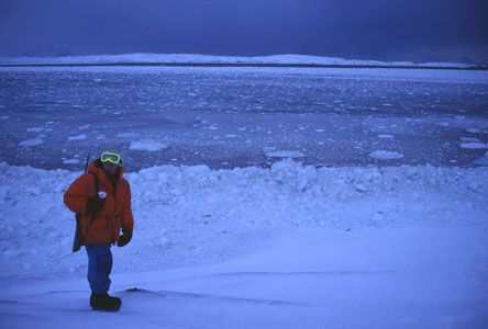 En fin d’été, le froid polaire s’installe, parfois brutalement (–40°C); la surface de l’océan se refroidit. Quand elle atteint –1,8°C, les premiers cristaux de glace se forment. Une fois la surface gelée, l’eau de mer se trouve isolée de l’air froid et le processus se ralentit. La banquise s’épaissit alors lentement, par sa face inférieure, jusqu’à atteindre environ 2 mètres.