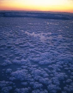 La nature de la première glace dépend de l’état de la mer. Par temps calme, de grands cristaux en forme d’aiguilles s’orientent parallèlement et forment une couche de 1 à 2 cm d’épaisseur en surface (une ” soupe ” glacée). Si la mer est agitée, de petits cristaux se développent en tout sens sur parfois un mètre de profondeur, constituant une épaisse couche visqueuse : le frasil. C’est ensuite seulement, que la congélation commence en surface. Cette prise peut durer de 9 à 36 jours.