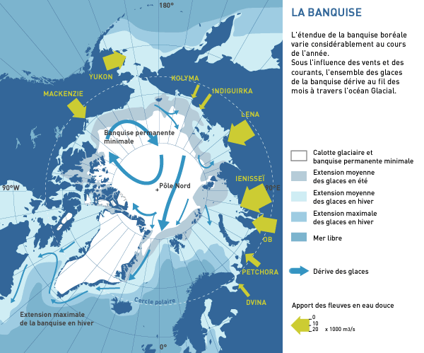 Au coeur de l’hiver, la banquise s’étend sur près de 15 millions de km2, dont près de la moitié fondra durant l’été. La partie restante persistera 2, 3, 4 ans ou plus et son épaisseur atteindra alors 4 à 5 mètres. Pendant ce temps, cette croûte de glace traversera l’Océan Glacial, emportée par les courants : c’est la dérive arctique.
