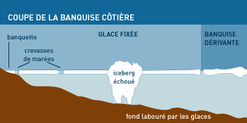 Près des côtes, la banquise est aussi façonnée par les marées, les apports d’eau douce, les courants littoraux, l’exposition au vent ou au soleil. Une banquette de glace, posée sur le fond, reste attachée à la côte. Cette “glace riveraine” peut être plus épaisse que la banquise elle-même et s’ancrer au fond ; au large, elle se prolonge par une bande de “glace fixée” (en anglais fast ice), qui peut survivre plus de 10 ans. On y trouve parfois quelques icebergs prisonniers.