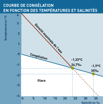 La couche d’eau superficielle de l’océan Arctique est particulièrement favorable à la congélation, car elle est adoucie par l’afflux d’eau relativement peu salée du Pacifique Nord et l’eau douce des grands fleuves boréaux. ” Alourdie ” par la baisse de température hivernale en surface, cette eau devrait plonger vers le fond ; or, en Arctique, une couche d’eau beaucoup plus salée – donc plus dense – bloque cette plongée et oblige l’eau de surface à rester plus longtemps en contact avec l’air froid.