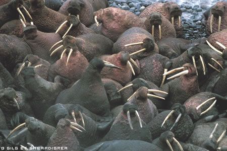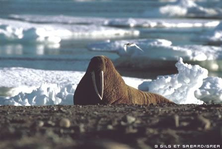Gros mammifère rebondi (jusqu’à 1200 kg !) aux impressionnantes défenses – des canines modifiées -, le morse vit en troupeaux sur les rives arctiques. Autour du museau, il porte des “moustaches” tactiles, très raides. Labourant les fonds marins avec ses défenses, il se nourrit de mollusques qu’il broie avant de les “aspirer” ; il peut, à l’occasion, manger du phoque.